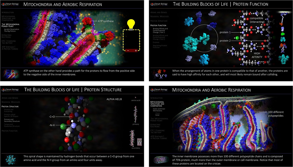 This comprehensive set of animations includes the following modules: 1. Protein Structure. 2. Protein Function. 3. Introduction to Mitochondria and Aerobic Respiration. 4. Mitochondrial Structure and Composition. 5. The Mitochondrial Power Plant. Emphasis is given to the structure/function relationship, protein-protein interactions, and conformational changes. Each topic is extensively covered and all major proteins are discussed in detail. The package includes 17 videos, each ~3-4 minutes in length, as well as an online discussion board. *Please read all important information below BEFORE purchasing!*